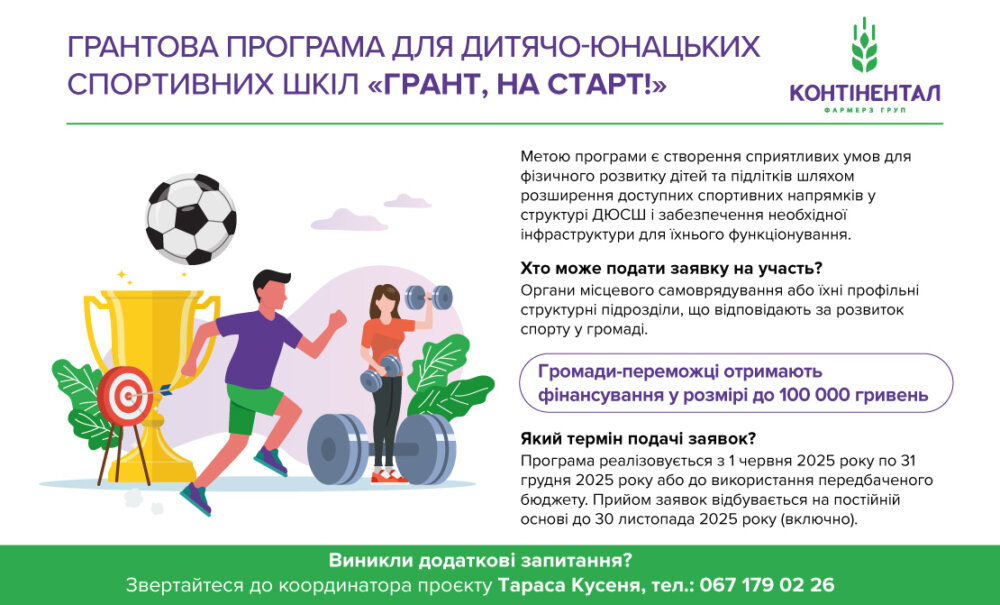 У рамках своєї корпоративної соціальної відповідальності «Контінентал Фармерз Груп» запускає нову грантову програму «Грант, на старт!». Ініціатива спрямована на підтримку появи нових спортивних секцій на базі дитячо-юнацьких спортивних шкіл у громадах присутності Компанії.