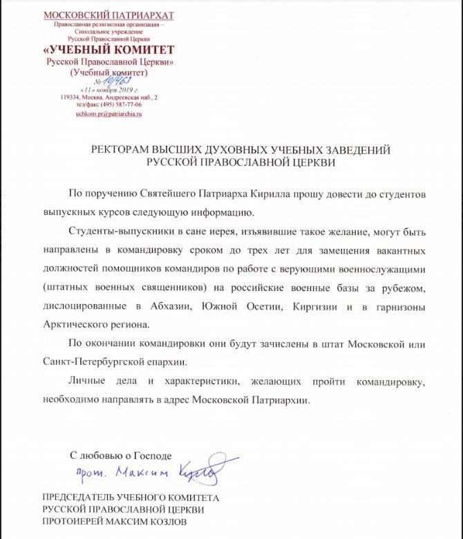 Як сказано у листі, за дорученням Московського Патріарха Кирила ректорам духовних навчальних закладів слід агітувати священиків-випускників відправитись у трьохрічне відрядження для духовної опіки над російськими вояками в якості помічників командирів по роботі з віруючими військовослужбовцями (штатних військових священиків) на закордонних військових базах РФ, які дислокуються в Абхазії, Південній Осетії, Киргизії та в гарнізонах Арктичного регіону.