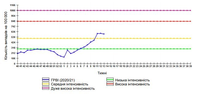 Загальна захворюваність на грип та ГРВІ за останні 7 днів склала 588,3 випадки на 100 тисяч населення (за останні 7 днів захворіло 6091 особа), що в 2 рази перевищує рівень епідемічного порогу, та відповідає високому рівню інтенсивності епідемічного процесу.