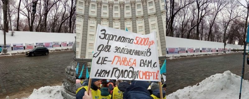20 працівників залізниці з Тернопільщини протестують в Києві під Кабміном. Про це повідомив голова профспілкової організації тернопільської дистанції Львівської залізниці Святослав Бугай.