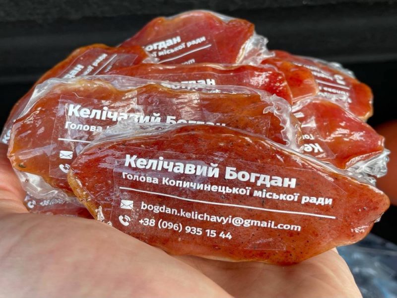 Голова Копичинецької громади, що на Чортківщині, Богдан Келічавий оригінально підійшов до виготовлення власних візиток. Замість звичайний паперових держслужбовець виготовив оригінальні візитки із в’яленого м’яса.