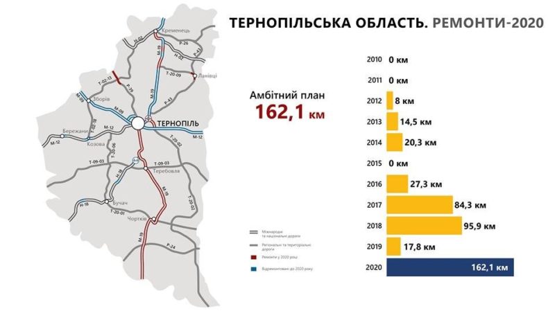 Сумарно впродовж 2020 року у Тернопільській області держава відремонтує 237 км місцевих, комунальних і державних доріг.