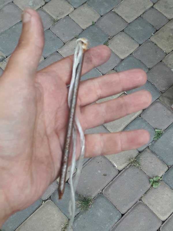 А той на стовбі знайшов… цвях 200-ку, вставлений між двома проводами! А тепер подивіться фото. Вставити цвях не так то і просто! Потрібна драбина, як мінімум. Ну і людина, яка це зробила, мала би мати навички роботи з проводами з напругою, інакше сама з великою ймовірністю постраждала би.