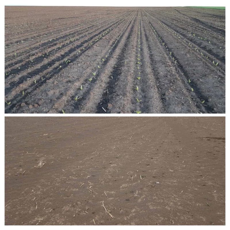 “Піщана буря на Тернопільщині. Такого тут не пам‘ятають. На фото поле з цукровим буряком до і після. В сто гектарів вкладено приблизно 2 мільйони, які пісок закопав за хвилини.