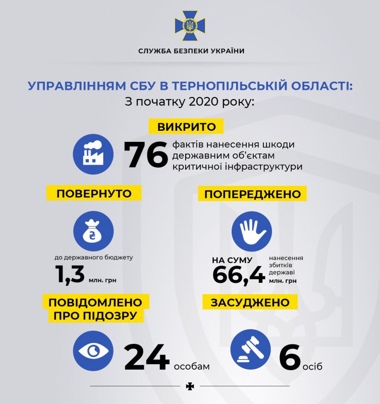 Так, оперативники спецслужби попередили протиправне відчуження у громади Тернополя будинку в центрі міста, вартість якого перевищувала 35 мільйонів гривень. Історичну будівлю колишньої залізничної лікарні зловмисники намагалися приватизувати за суттєво заниженою ціною. За матеріалами СБУ місцевою прокуратурою відкрито кримінальне провадження, за ст. 364 (зловживання владою або службовим становищем) Кримінального кодексу України.