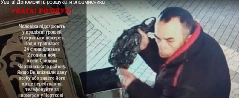 Працівники Чортківського районного відділу поліції просять допомогти встановити особу невідомого, причетного до крадіжки грошей зі скриньки пожертв.