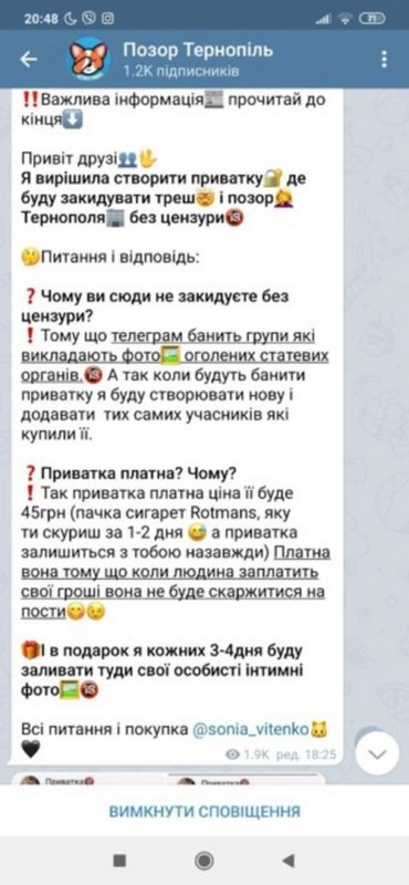 «Позор Тернополя» – саме так називається анонімний чат у «Телеграм-каналі» та «Інстаграмі». На сторінці каналу адміністратор виставляє фото провокаційного характеру з інформацією про жертву, яка зображена на ньому. Суть цієї «гри» у тому, аби спіймати свого товариша на чомусь непристойному. А допомогти в цьому може випитий алкоголь. Під одним із постів зустрічаємо слова: «Надія О. 15 років, Тернопільська область, буха в хлам» або інше: «Розвів малишку на секс. Район центр, малій 17 років». На фото чітко зображено оголене тіло дівчинки, яку без тями тягнуть до ванної кімнати парубки. Адміністратор групи називає себе Соня Вітенко. На вигляд дівчині приблизно 18 років. За найбільш провокаційні фото вона обіцяє виставляти особисті інтимного характеру. В цьому анонімному чаті понад мільйон підписників. За вступ туди дівчині на банківську картку слід перерахувати 45 грн. Після цього вона приймає ваш запит і ви маєте повний доступ до фото та відеоматеріалів.