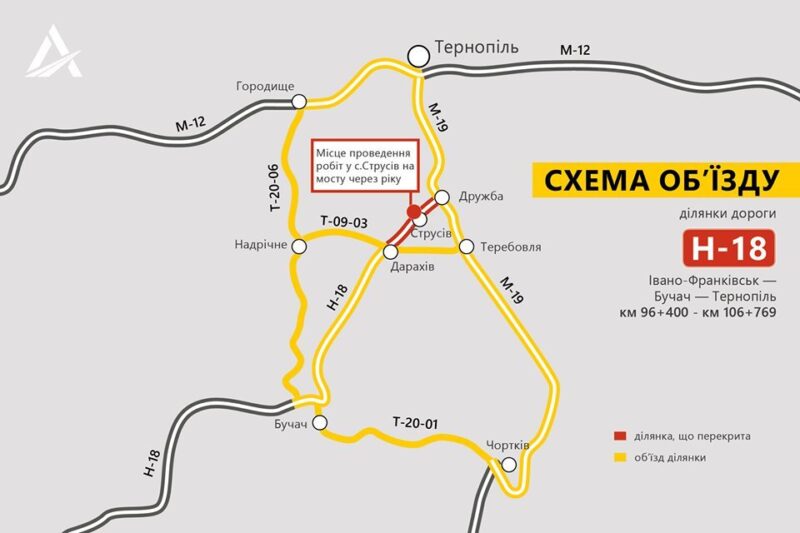 У зв’язку з початком капітального ремонту мосту у селі Струсів, рух транспорту через відрізок автошляху Н-18 Івано-Франківськ – Бучач – Тернопіль у Теребовлянському районі буде обмежено.