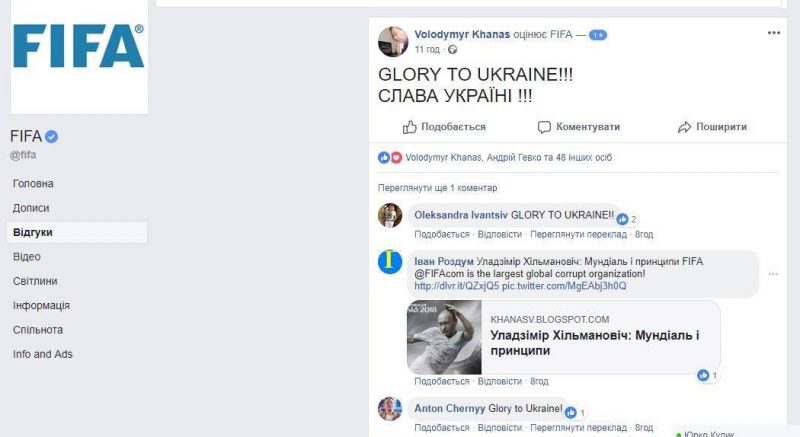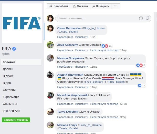 Офіційну сторінку FIFA у Facebook атакують люди, коментують усі пости на підтримку хорватів та в кінці кожного коментаря пишуть Слава Україні!