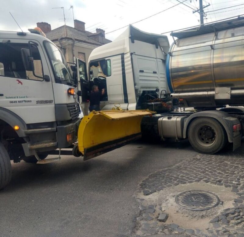 На Тернопільщині — ні дня без ДТП. Так, у Бережанах ледь не спалахнула вантажівка, в яку врізалася спецтехніка.