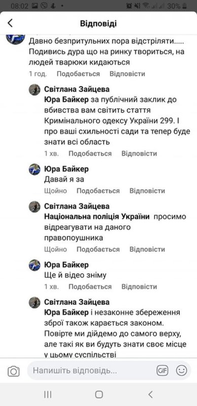 “Полювання на неадекватів розпочато, ми зупинимо полювання на безпритульних тварин! В цій країні існує закон, якого мають дотримуватися усі. Але окремі індивідуми звикли, що їм можна все! Публічний заклик до насилля над тваринами карається Кримінальним кодексом України, стаття 299. Даний суб’єкт не тільки висловив погрози, а щей обіцяє зняти відео, що вже наштовхує на думку про його психічні проблеми. Прошу В.П Заліщики застосувати міри покарання до даного громадянини України і перевірити дозвіл на зброю, надіємося на небайдужість і органів влади в м.Заліщики.