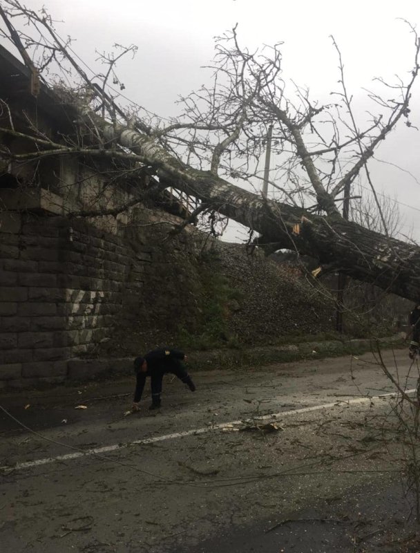 Сьогодні у Теребовлі через пориви сильного вітру впало дерево, перекрило частину проїзної дороги по вул. Князя Василька і частину залізничної колії.
