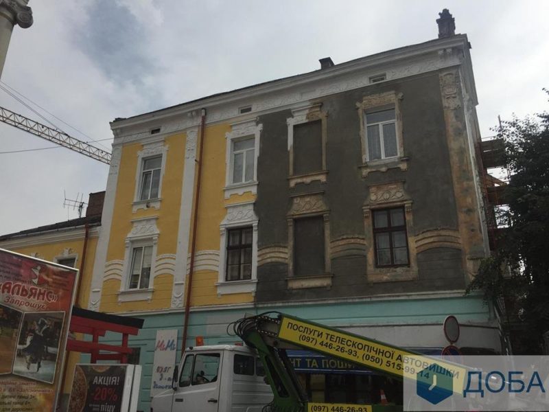 У центрі Тернополя на бульварі Тараса Шевченка працівники підрядної організації оновлюють фасад старовинного будинку, більш відомого як житлово-торгівельний будинок «Кооператор».