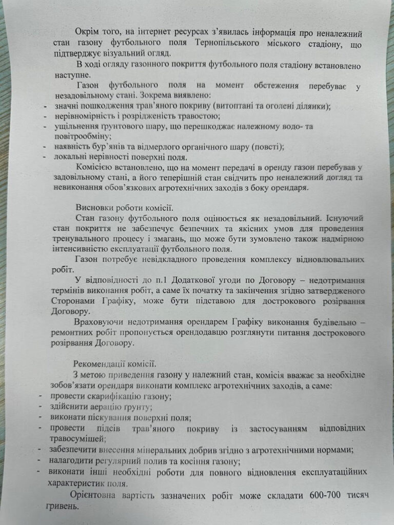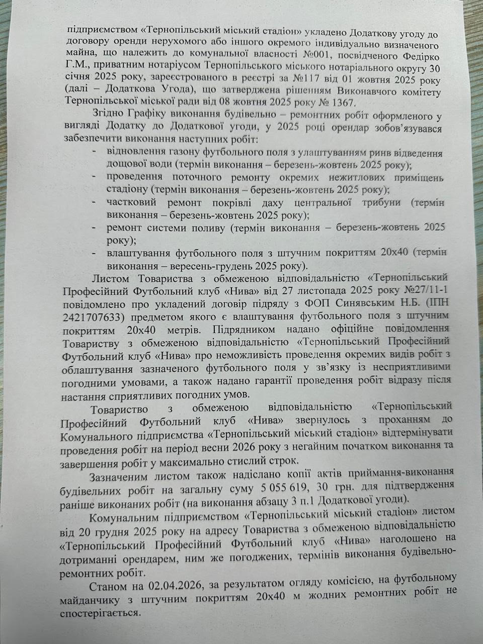 Листом від 20 грудня 2025 року КП «Тернопільський міський стадіон» офіційно наголосив орендарю на дотриманні погоджених термінів виконання будівельно-ремонтних робіт.