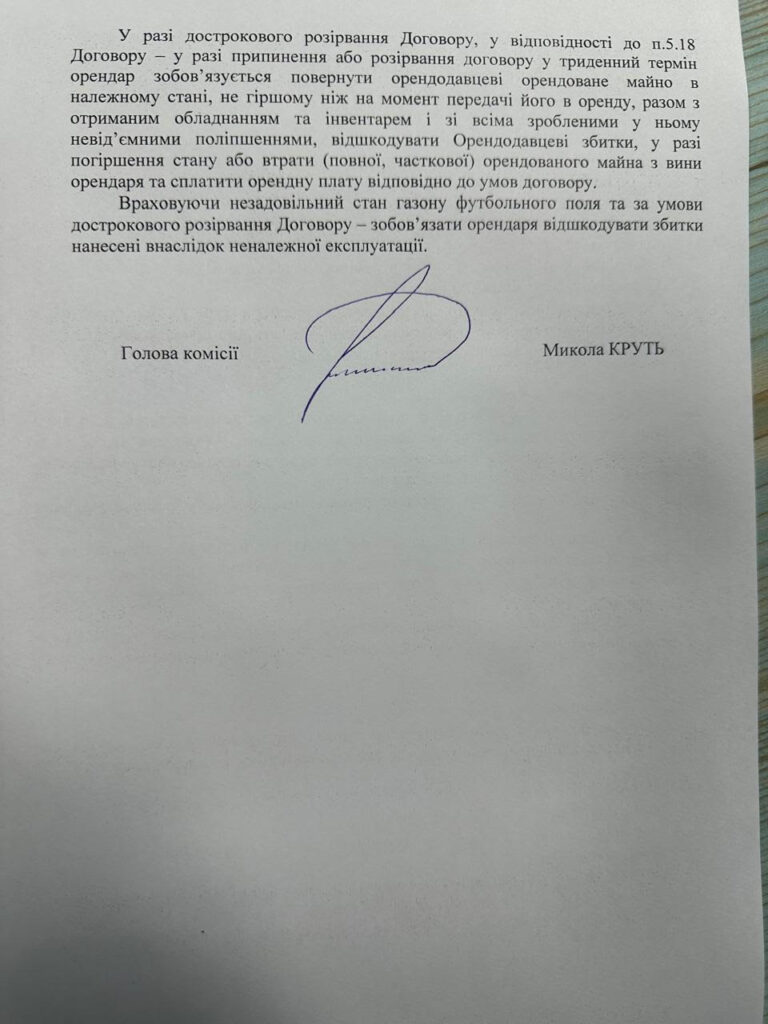 Стан покриття не забезпечує безпечних та якісних умов для проведення тренувального процесу і змагань — це не оцінка чиновників, це висновок комісії із залученням фахівця з догляду за газонами. Орієнтовна вартість відновлення — 600–700 тисяч гривень. За рахунок кого має оплачуватись ця сума, якщо збитки нанесено орендарем?