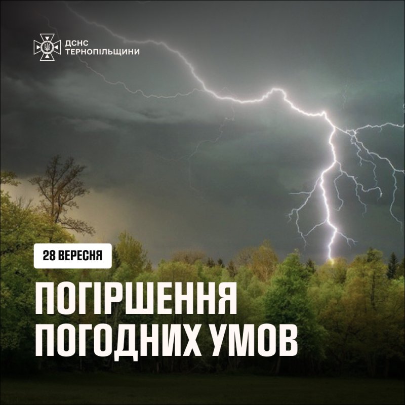 Згідно з повідомленням Тернопільського обласного центру з гідрометеорології, 28 вересня вдень очікуються грози, у північній частині області – значні дощі (15-49 мм). У селенебезпечних районах 15-29 мм за 12 годин або менше. Місцями можливі шквали вітру зі швидкістю 15–20 м/с.