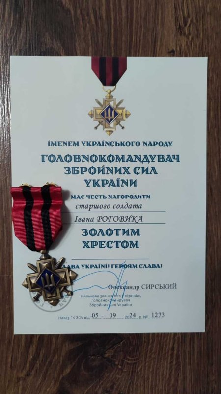 Захисник з Тернопільщини Іван Роговик отримав почесний нагрудний знак головнокомандувача ЗСУ “Золотий хрест”.