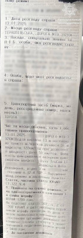 близько 14-ї години, під час контролю швидкості за допомогою лазерного пристрою TruCAM, на автодорозі М-19 Доманове — Тереблече, патрульні зупинили автомобіль Toyota, який у межах населеного пункту рухався зі швидкістю 122 км/год.