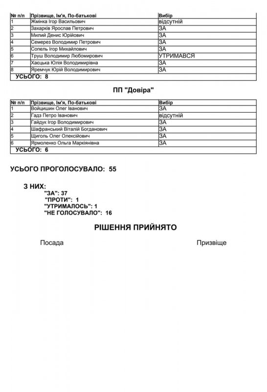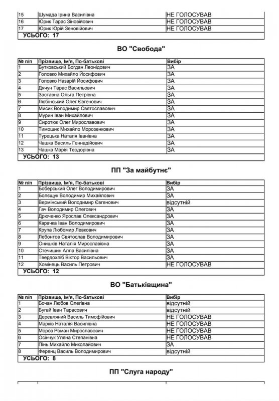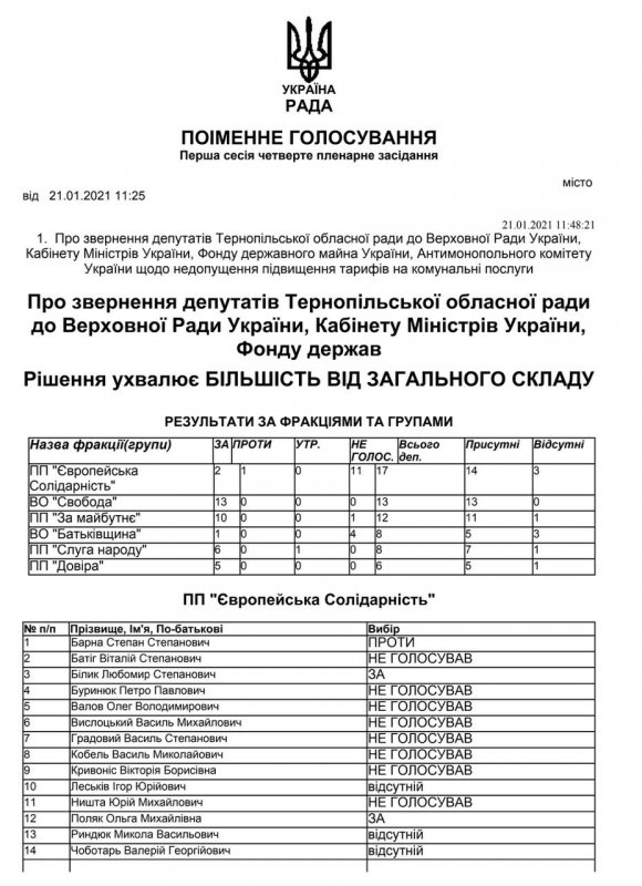 Не підтримали звернення щодо необґрунтованого підвищення тарифів на комунальні послуги разом із Степаном Барною й інші представники фракції «ЄС». Зокрема, Віталій Батіг, Петро Буринюк, Олег Валов, Василь Вислоцький, Василь Градовий, Василь Кобель, Вікторія Кривоніс, Юрій Ништа, брати Юрики та Ірина Шумада, яка, до слова, поставила свій підпис під погодженням проекту щодо підвищення тарифу ПрАТ «Тернопільгаз» на 2021 рік під час публічних слухань.