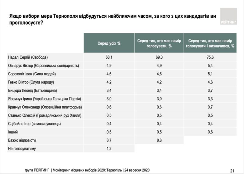 При такому розподілі голосів результат виборів у Тернополі може бути визначений вже у першому турі. До-речі, подібна ситуація спостерігається в Івано-Франківську, Хмельницьку, та інших українських містах, де діючі міські голови націоналісти зберігали високий рівень підтримки протягом всіх років роботи.