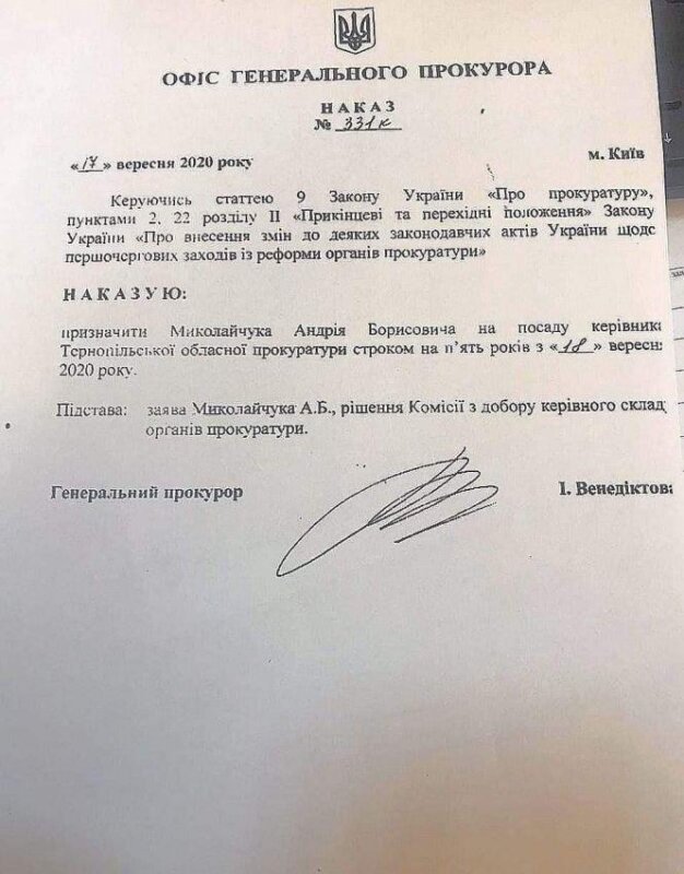 Схоже, що після Ірина Венедіктова призначила нового прокурора Тернопільщини. Роман Довбенко опублікував фото копії наказу про призначення Андрія Миколайчука керівником Тернопільської обласної прокуратури.