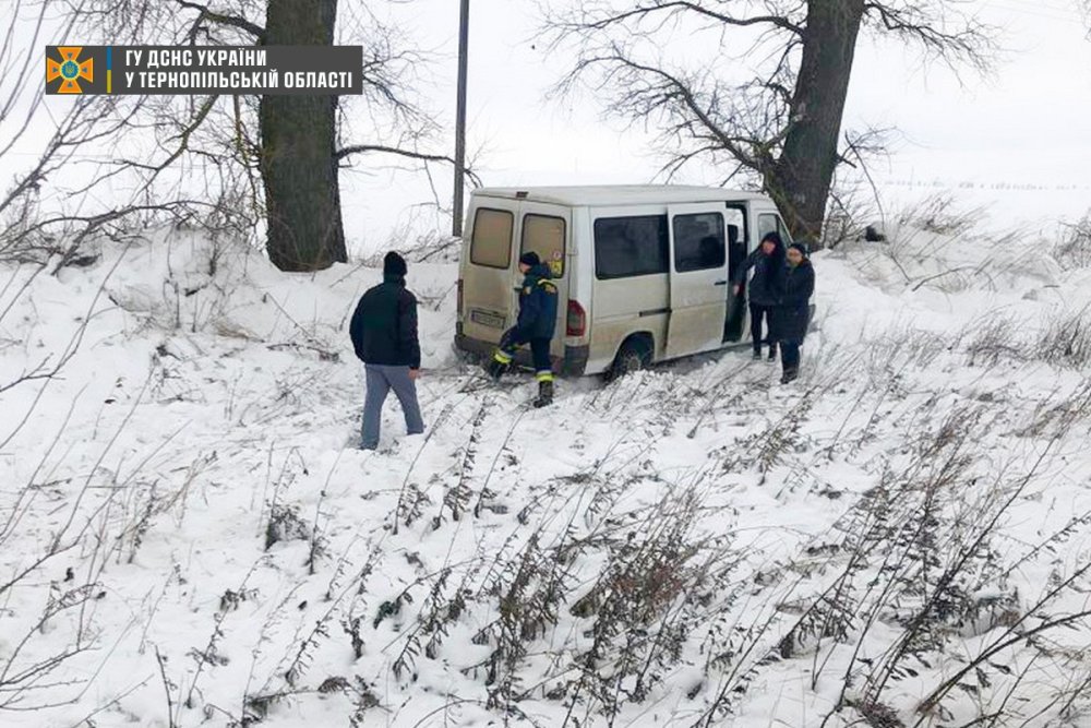 На Тернопільщині рятувальники витягували зі снігової пастки мікроавтобус з 10-ма дітьми і молоковоз
