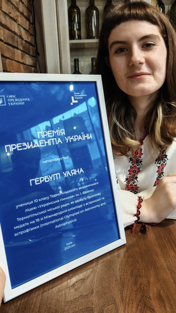 Уляна стала лауреаткою президентської премії як переможниця міжнародної учнівської олімпіади з астрономії та астрофізики, що проходила в індійському місті Мумбай, повідомили на сторінці міськради.