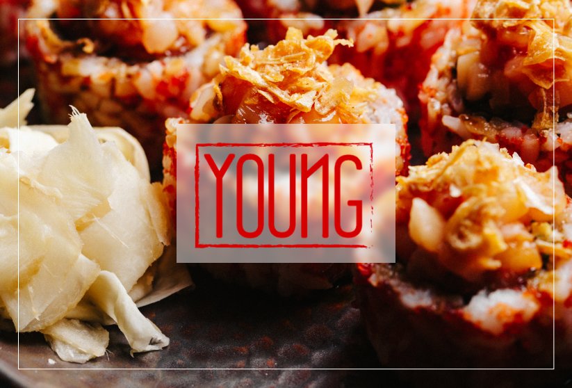 - Рол Ф’ютаго з маринованою редискою та кімчі. Сама назва вже говорить про те, що замовити суші Young – це гарантувати смакове здивування. Комбінація традиційних компонентів для ролів разом з маринованою редькою та кімчі точно принесе гастрономічну насолоду. Авторські соуси Янг доповнюють ексклюзивні смаки та підкреслюють фірмовий стиль закладу.